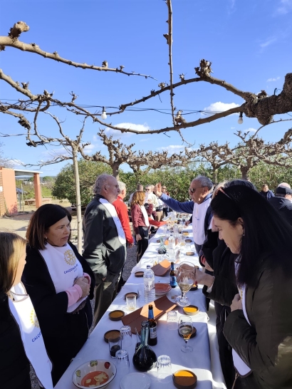 Tras el festín exterior, la celebración se trasladó al interior del salón rústico de La Montoliva. Entre paredes de piedra y una decoración que evoca la historia rural, las mesas se llenaron de carne a la brasa, judías y el indispensable vino de la zona.